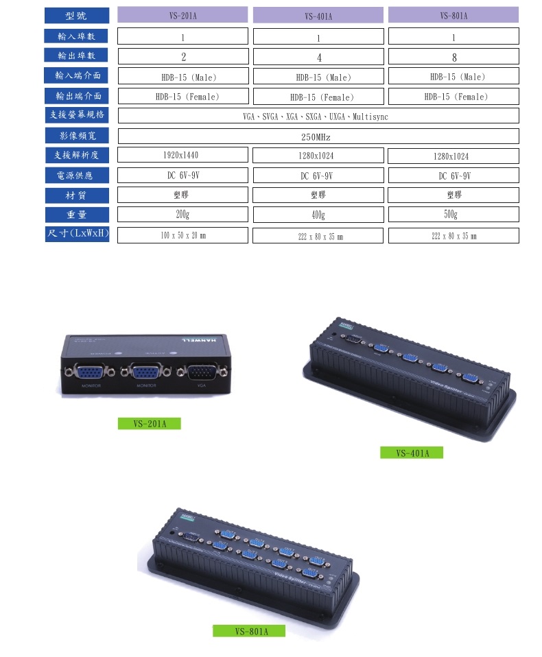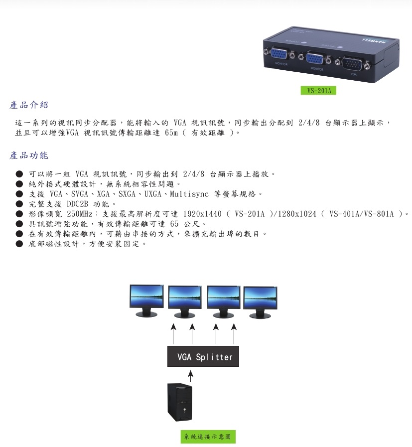 可以將一組 VGA 視訊訊號,同步輸出到 8 台顯示器上播放。
