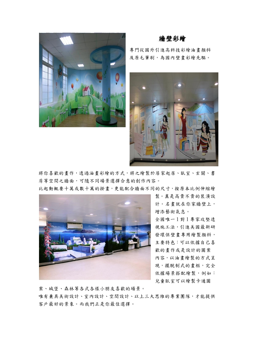 專門從國外引進高科技彩繪油畫顏料及原毛筆刷,國外特殊漆料(透明感光)在不同的光源下照明會產生不同的效果為國內壁畫彩繪先驅。
